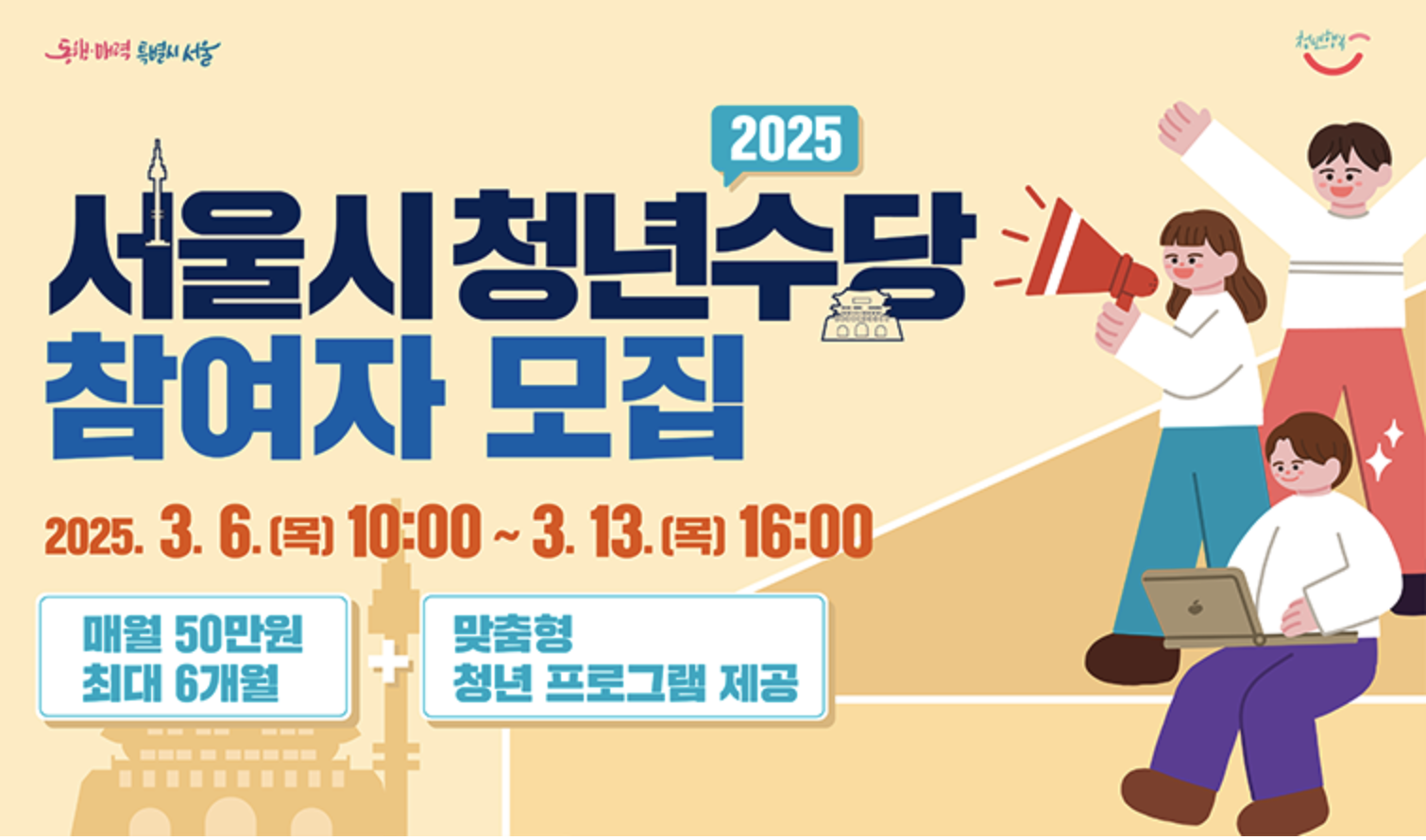 신청 방법: 청년몽땅정보통(youth.seoul.go.kr)에서 온라인 접수.